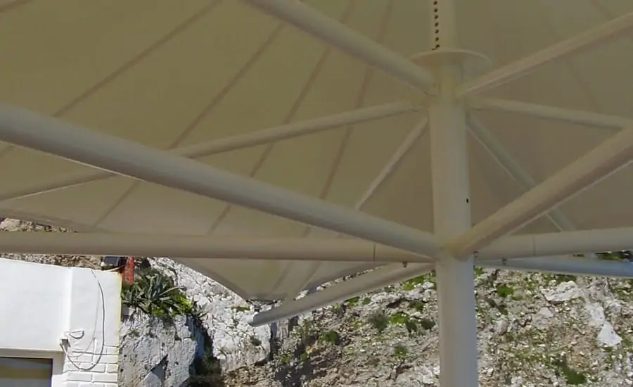 The Caleta Hotel, built on the sub-tropical island of Gibraltar, is an exclusive luxury hotel where guests go to unwind from the stresses and strains of everyday life. Unsurprisingly, therefore, the owners of the hotel chose to install a sharp and crisp white twin conical canopy to shade the terrace and protect their guests.