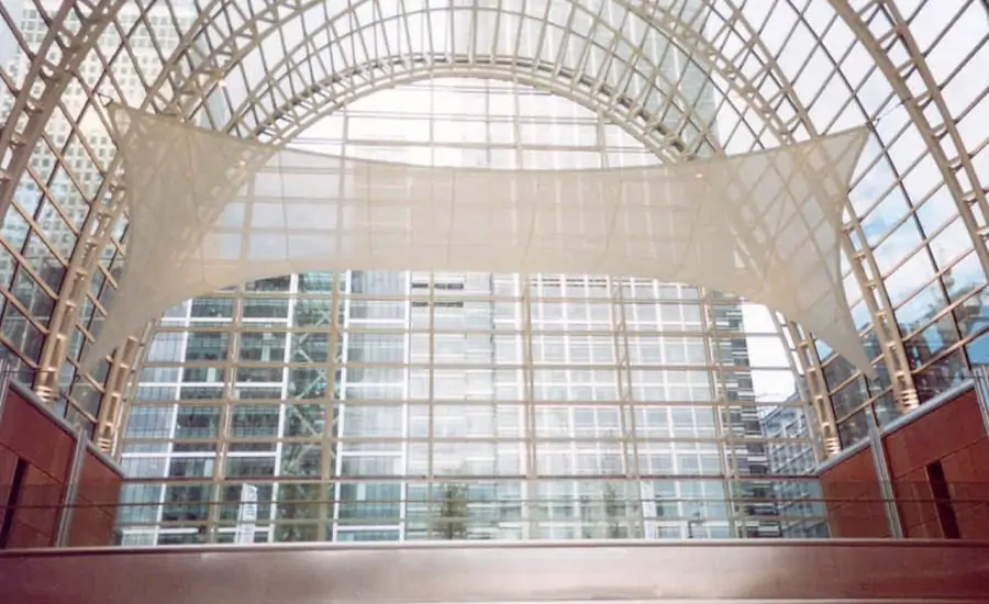 The installation which is a 23 metre long fabric membrane made from PVC coated glass fibre, stretches from one side of the glass atrium to the other.