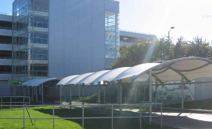 2no PVC glazed walkways (between airport terminal and railway station) and 1 kiosk canopy. About making an impact.