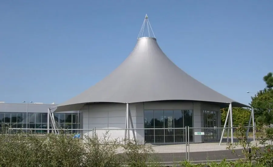 For a Ford showroom in Stevenage, Architen Landrell was asked to design, manufacture and install a conical tensile canopy to cover an octagonal shaped steel framed glazed area where cars were displayed.