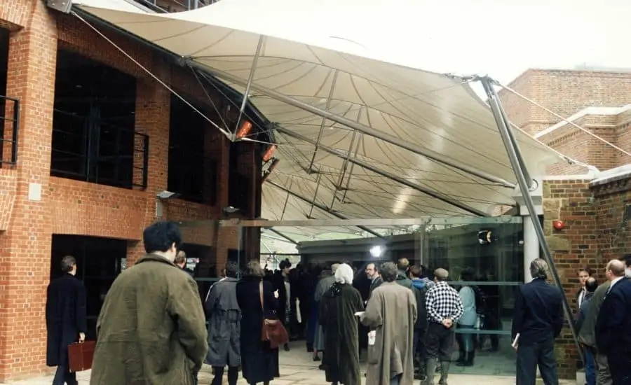 The dramatic fabric entrance canopy installed in the external foyer between the main building and the old backstage area can only add to the overall experience of the theatre. The symmetrical lines of the fabric structure make it a delicate and informal addition, yet allow it to complete the existing building. While the open and airy nature of the roof would be impractical for most permanent buildings, the Glyndebourne season lasts for only six weeks in the summer and there is therefore no need to enclose the space. The fabric canopy provides sufficient shelter from the British weather and the foyer and gardens become a single harmonized space.