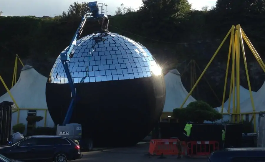 Our client, Newsubstance, were responsible for the installation of the mirrors to the disco ball and the installation of the structure at Bestival. Holding the structure in place high above the Bestival crowds was a 100 tonne crane.