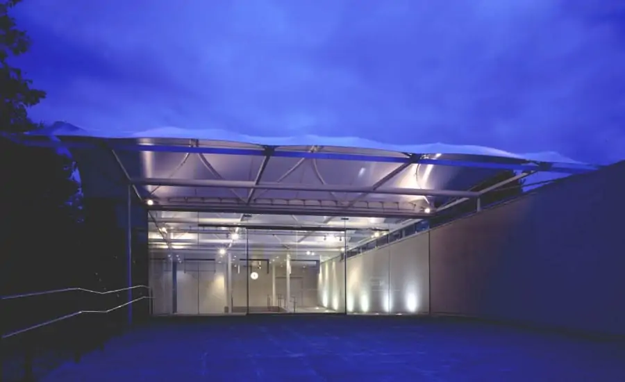 The transparent glass pavilion at the Institute of Art & Design in Surrey provides the home for one of Architen Landrell’s stunning fabric structures. The novel, compact fabric roof, cleverly designed to be erected despite height restrictions, combined with the sharp structural glazing, slender steelwork and subtle lighting, creates an enticing and welcoming entrance to the new Foyer Gallery.