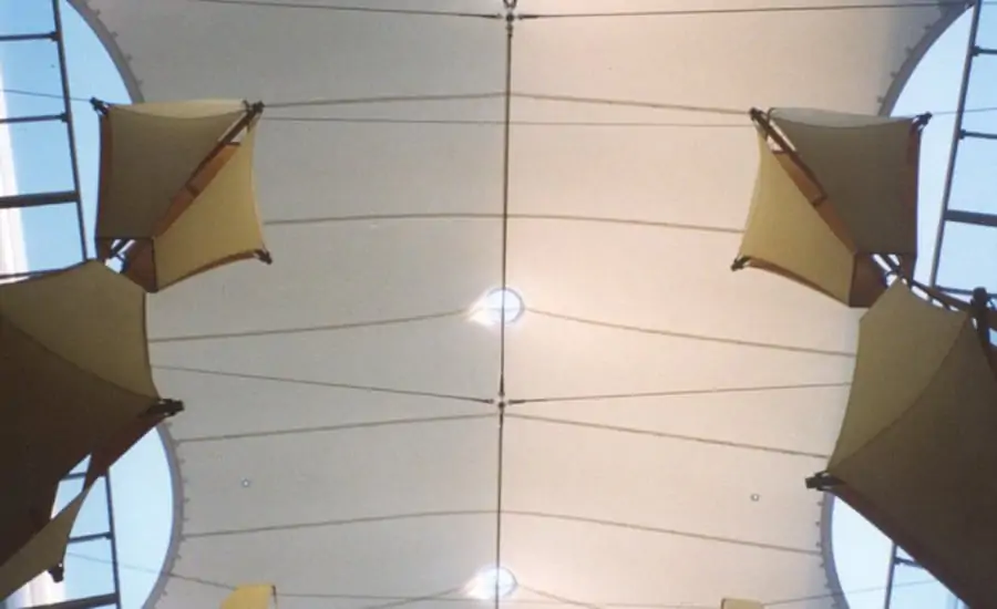 The 5,000m2 central food court of the ZOFRI complex is protected from the harsh sun of Northern Chile by the PVC coated polyester roof structure that employs passive ventilation. Winner of 1998 Outstanding Achievement award by International Fabric Association.
