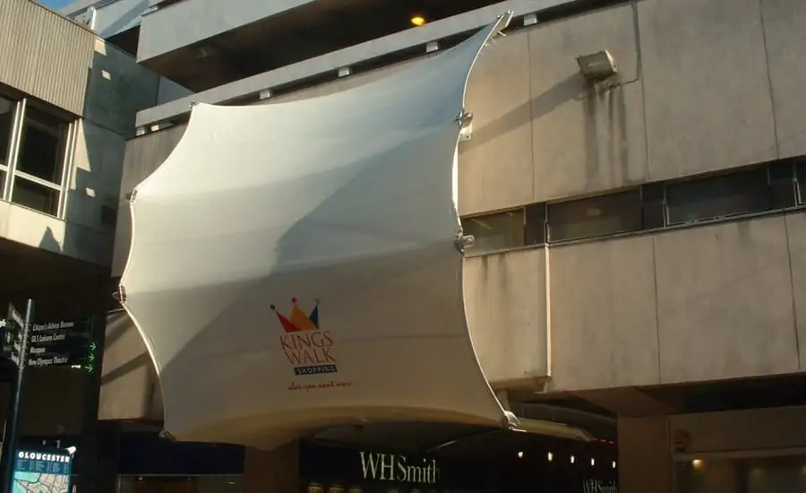 Illuminated by LED lighting, a series of architectural fabric sculptures helped transform Kings Walk Shopping Centre in Gloucester from a dull seventies arcade into a vibrant and colourful shopping experience.