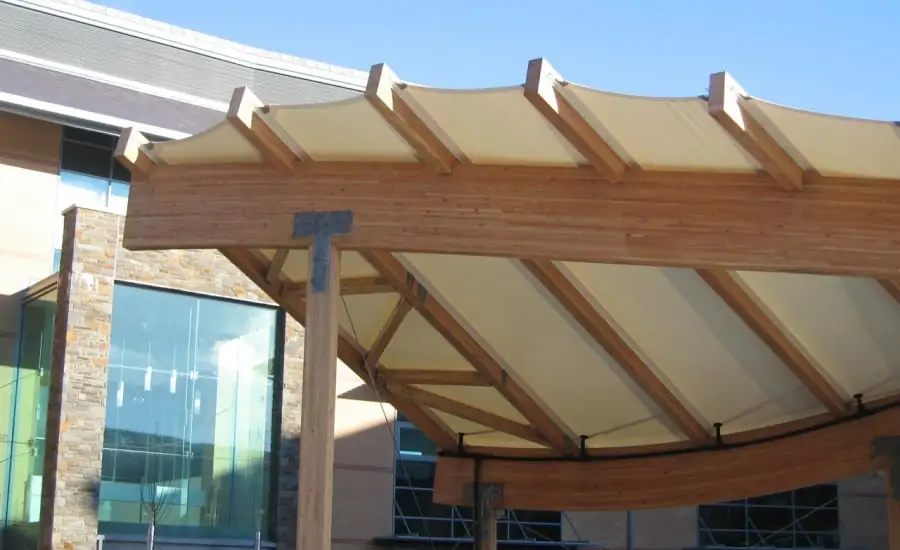 With undulating purlins and a fan like rafter arrangement, the canopy forms a focal point for the observer of the front of the building. Fabric was stretched to provide both a sheltered area for the disabled parking at the front of the building and a centrepiece for this landmark building.