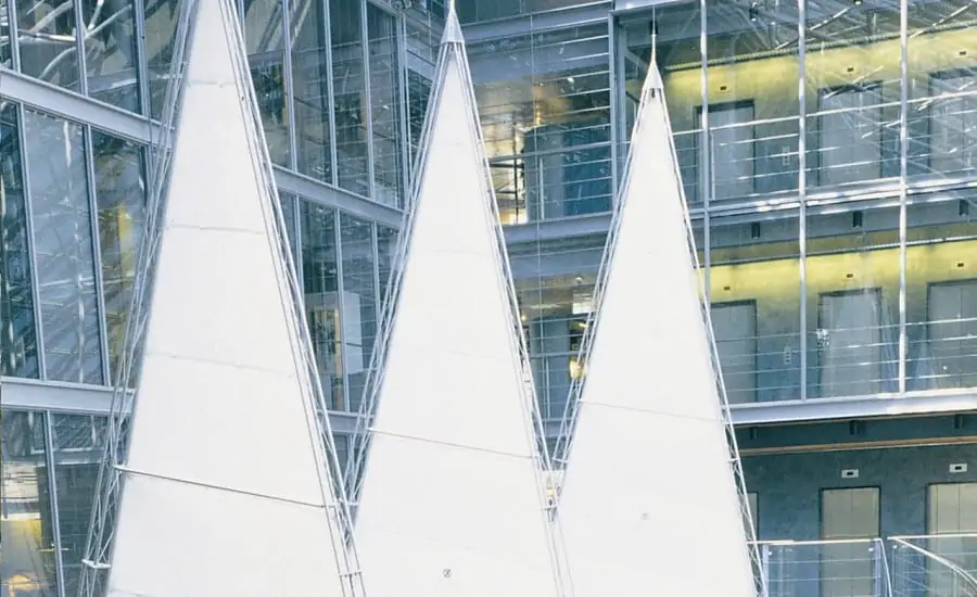 The huge structure, which is made up of three giant sails suspended in the glass atrium of the mobile phone companys headquarters, is an impressive sight to see. The PVC glass cloth sails stretch nearly one hundred feet from the top to bottom of the vast space to accentuate the height of the central atrium.