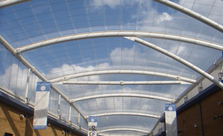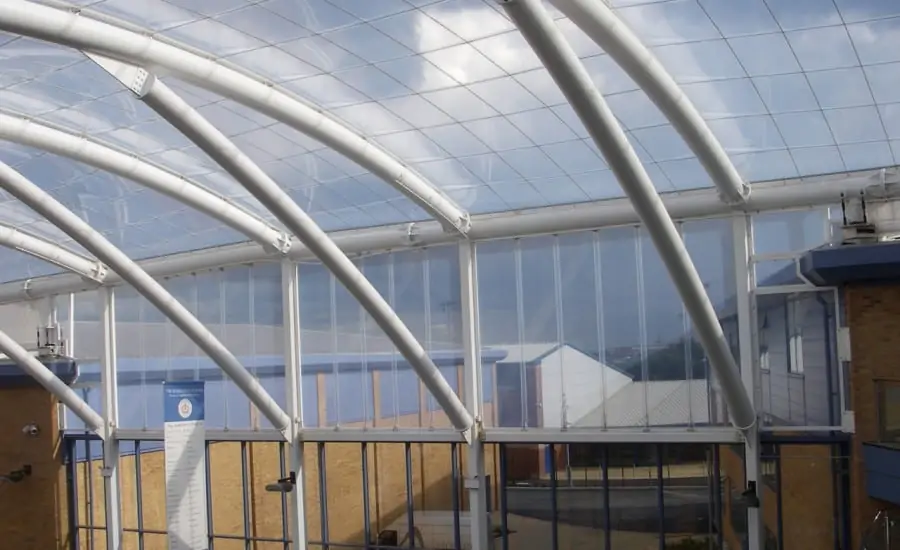 The roof, very similar to that installed at nearby Failsworth School, was created to provide a covered courtyard area where the 5 school buildings all intersect. The ETFE canopy provides pupils and teachers with a weather protected space for education and recreation which offers maximum light transmission with minimal structural impact on the building (unlike glass).