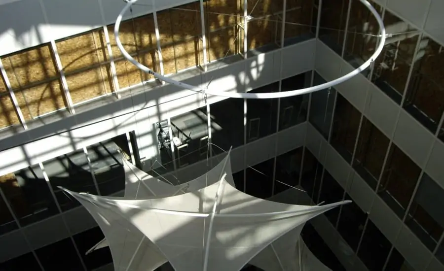 Multiple hypar forms are suspended in the tall atrium space of Reuters London office. Mesh fabric provides a complex filtering of light through multiple layers, modifying the appearance of the sculpture with the suns path.