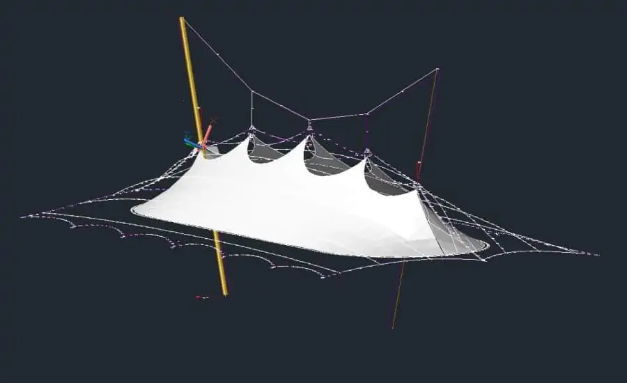The perimeter is held out by inclined posts and tie down bars. The gleaming white PTFE fabric harmonises with the white painted framing of the adjoining glazed structure.
