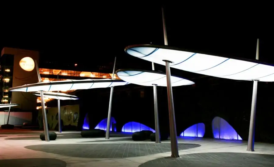 The structures consist of painted steel and blue fabric capsules supported by tapered steel masts, which appear to pierce through the fabric canopy, sharpening to a point above. The curvature of the canopies contrasts with the pointed steel masts, creating a dramatic effect which is enhanced by lighting.